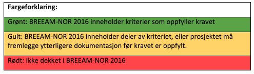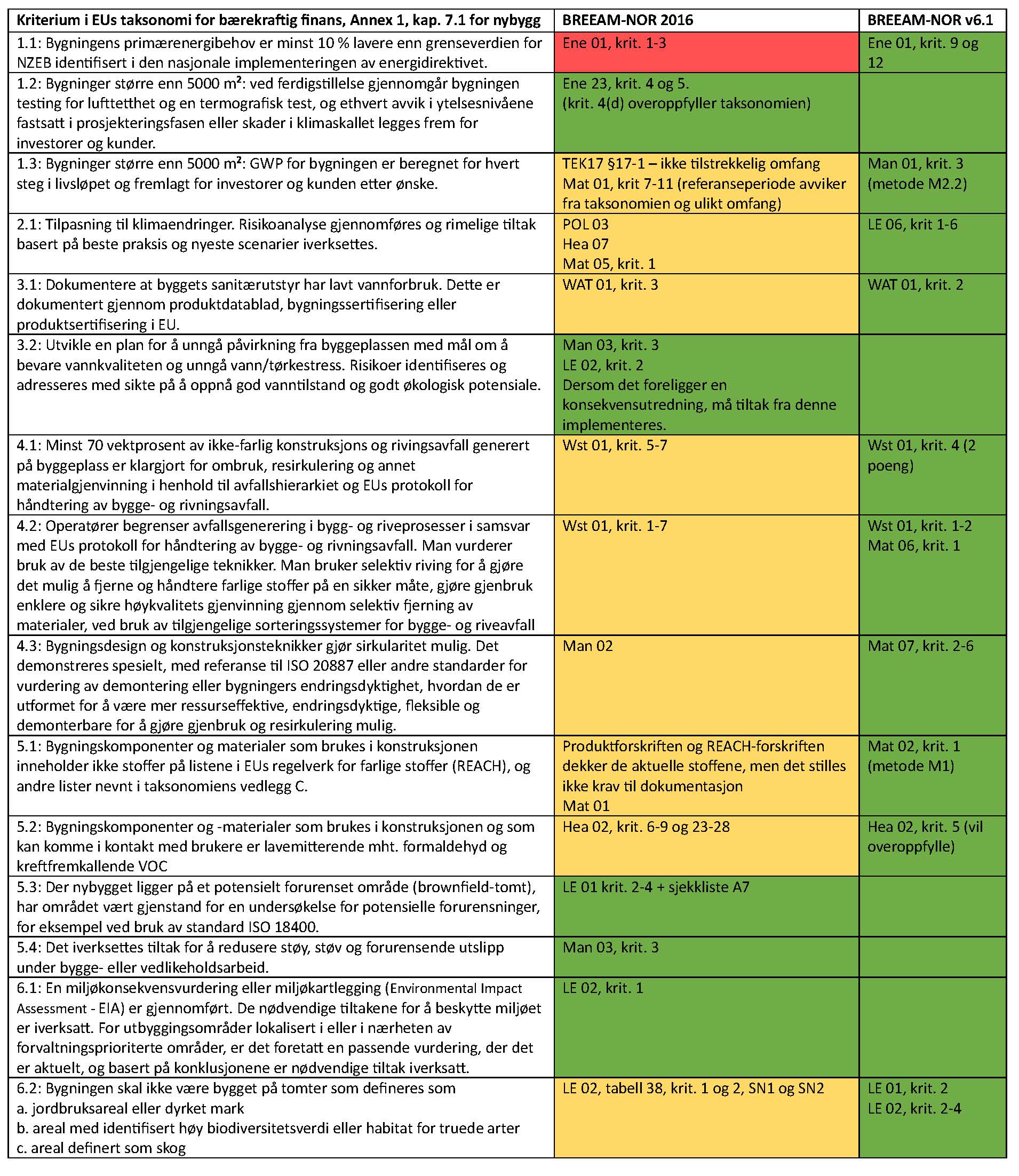 BREEAM-NOR v6 inkluderer taksonomiens kriterier for nybygg og rehabilitering i kriteriesett 1 «Bidra til å redusere og forebygge klimagassutslipp». Mange prosjekter er imidlertid registrert under den gamle manualen, BREEAM-NOR 2016. For de som ønsker å vise samsvar med taksonomiens kriterier for nybygg, har vi laget en oversikt over taksonomikriteriene og i hvilken grad BREEAM-NOR 2016 inneholder kriterier som bidrar til å oppfylle taksonomiens krav. Dersom man må fremskaffe ytterligere dokumentasjon for å oppfylle kravet, er dette markert med gult i tabellen. I de tilfellene BREEAM-NOR 2016 ikke inneholder kriterier som dekker taksonomiens krav, er dette markert med rødt i tabellen. Tabellen viser også hvordan BREEAM-NOR v6.1 kan hjelpe prosjektene ved å bruke ytelseskravet og dokumentasjonskravet som er spesifisert i BREEAM-NOR v6.1.